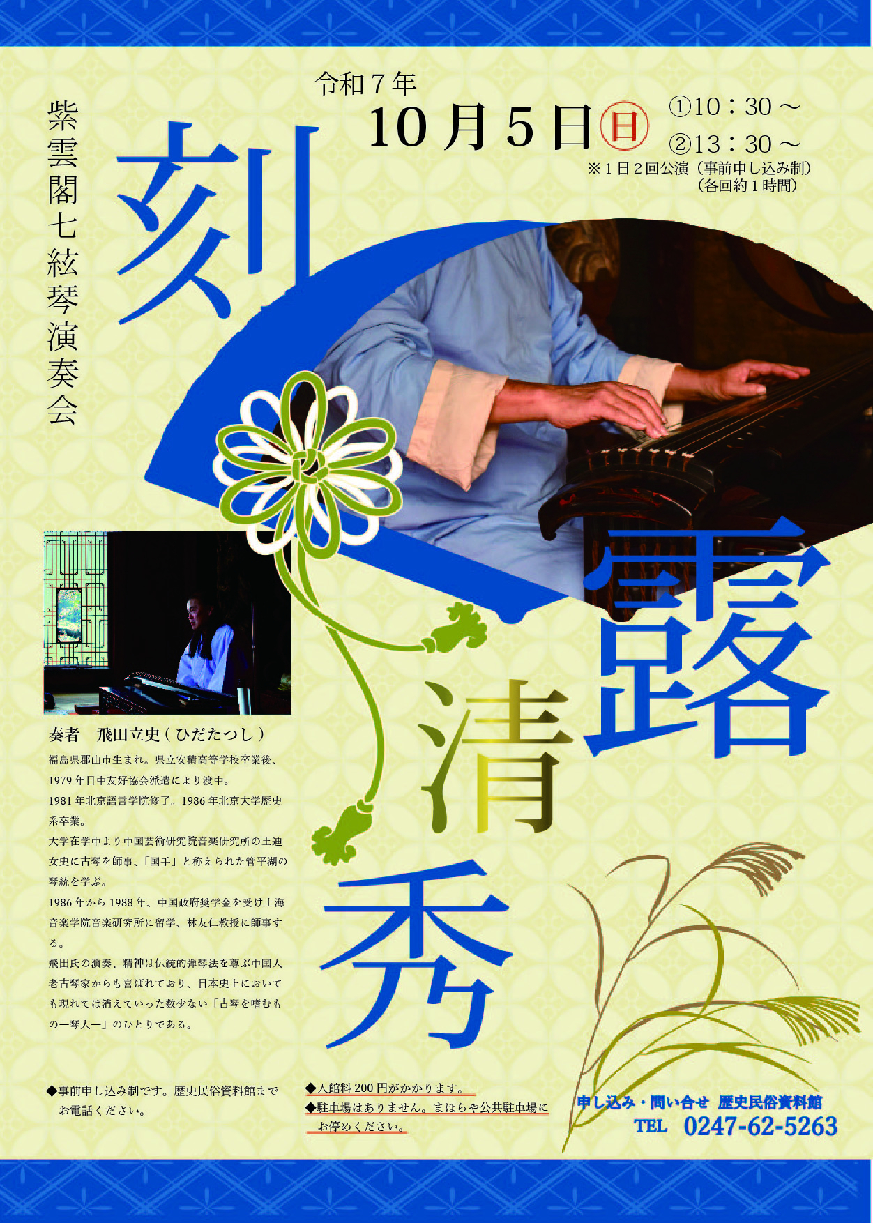 一般 200円(団体 150円) 小・中・高校生, 障がい者手帳をお持ちの方 100円(団体 70円) - 奏者 飛田立史 ( ひだたつし ) 氏