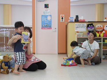 | ・読み聞かせボランティアの方による「出前おはなし会」を行いました。大型絵本や仕掛けのある絵本などに興味を持って、笑顔で参加していた子どもたち。親子でおはなしに触れることができ楽しい時間でした。 | ||