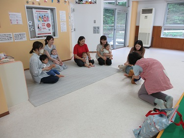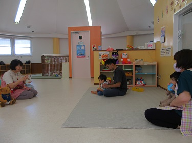 | ・「出前おはなし会」を行いました。絵本の読み聞かせを親子で楽しむ様子がありました!最後は、読み聞かせボランティアの方の手作り「ぱっちんカエル」で遊び、楽しい時間になりました。 | ||