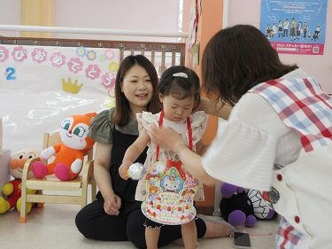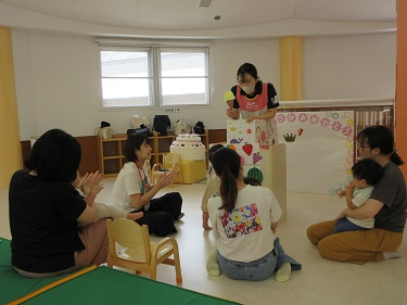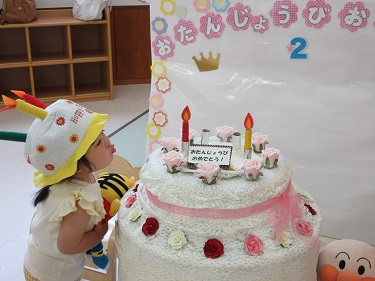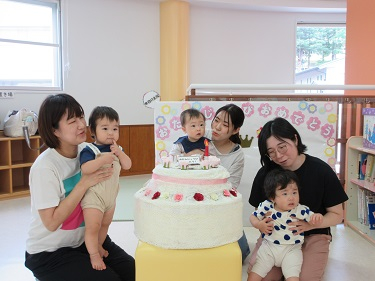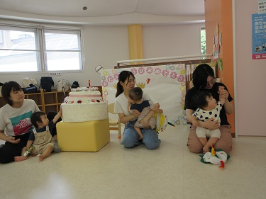 ・7月と8月に子育て支援センターで、お誕生会を行いました。たくさんのお友達から「ハッピーバースデー」の歌のプレゼントをもらい、ニコニコ笑顔の子どもたちでした。 | ||