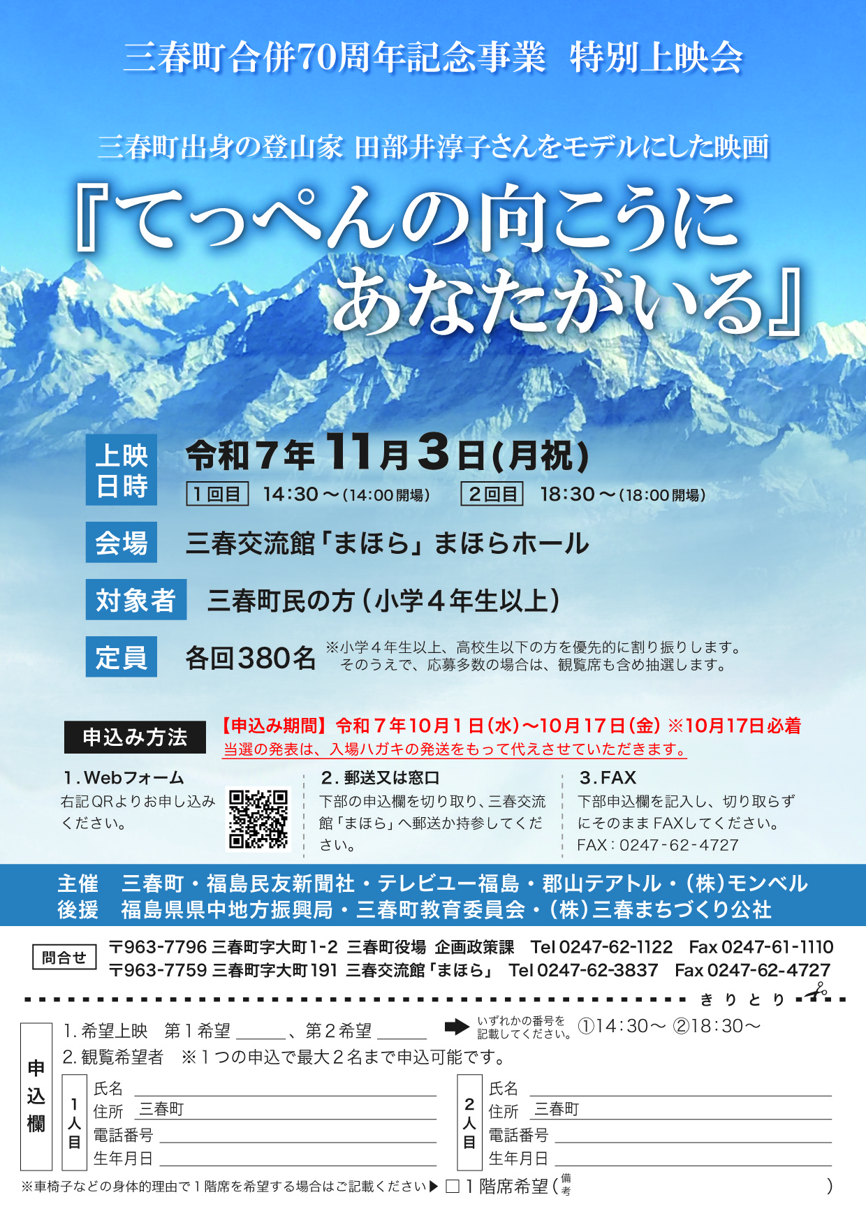 7.主 催:三春町・福島民友新聞社・テレビュー福島・郡山テアトル・㈱モンベル